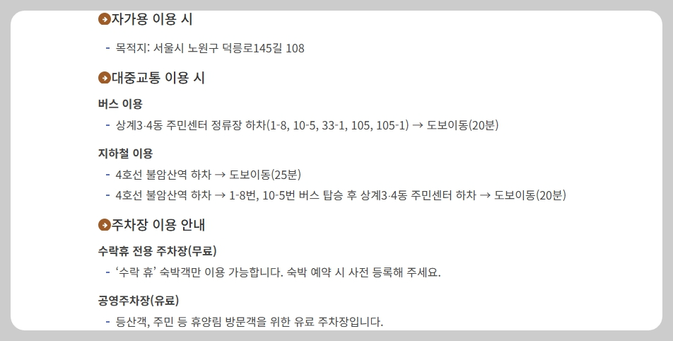 | 자가용 | ‘수락산 생태탐방연수원’ 또는 ‘수락산 체육공원’ 내비 검색 → 도보 10분 |