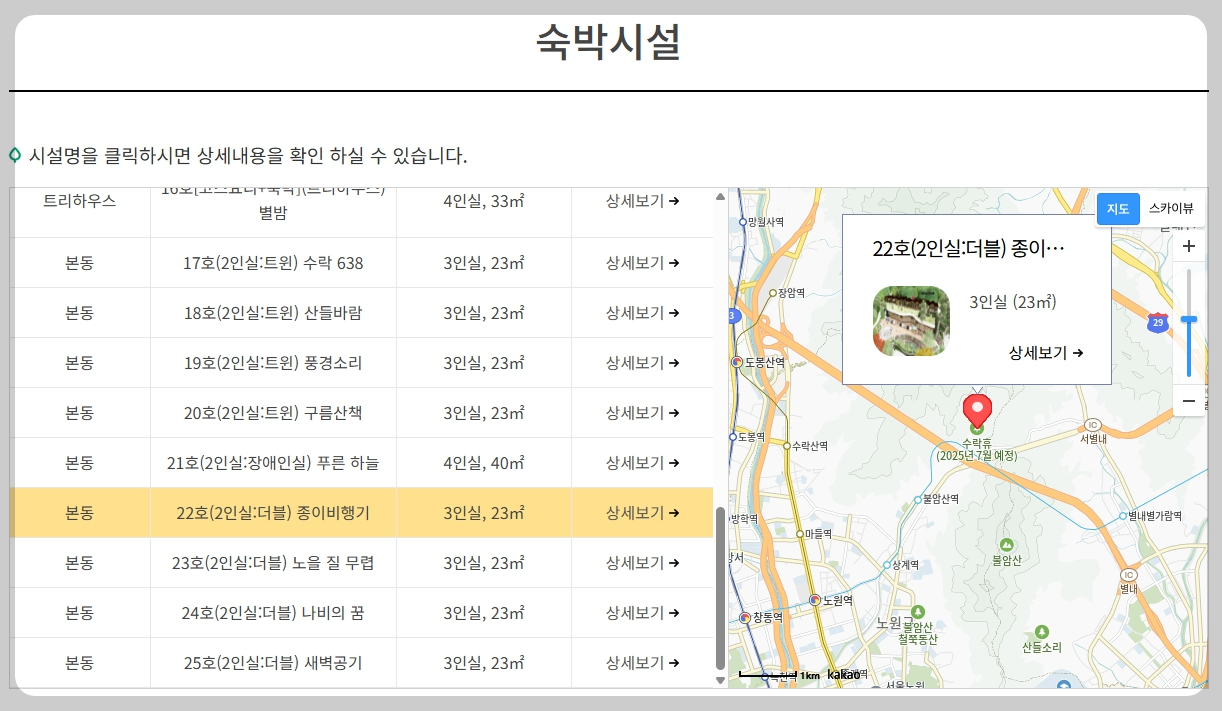 숲나들e 앱 또는 홈페이지에서 회원가입 후, ‘수락산 동막골 자연휴양림’을 검색해 예약할 수 있습니다.